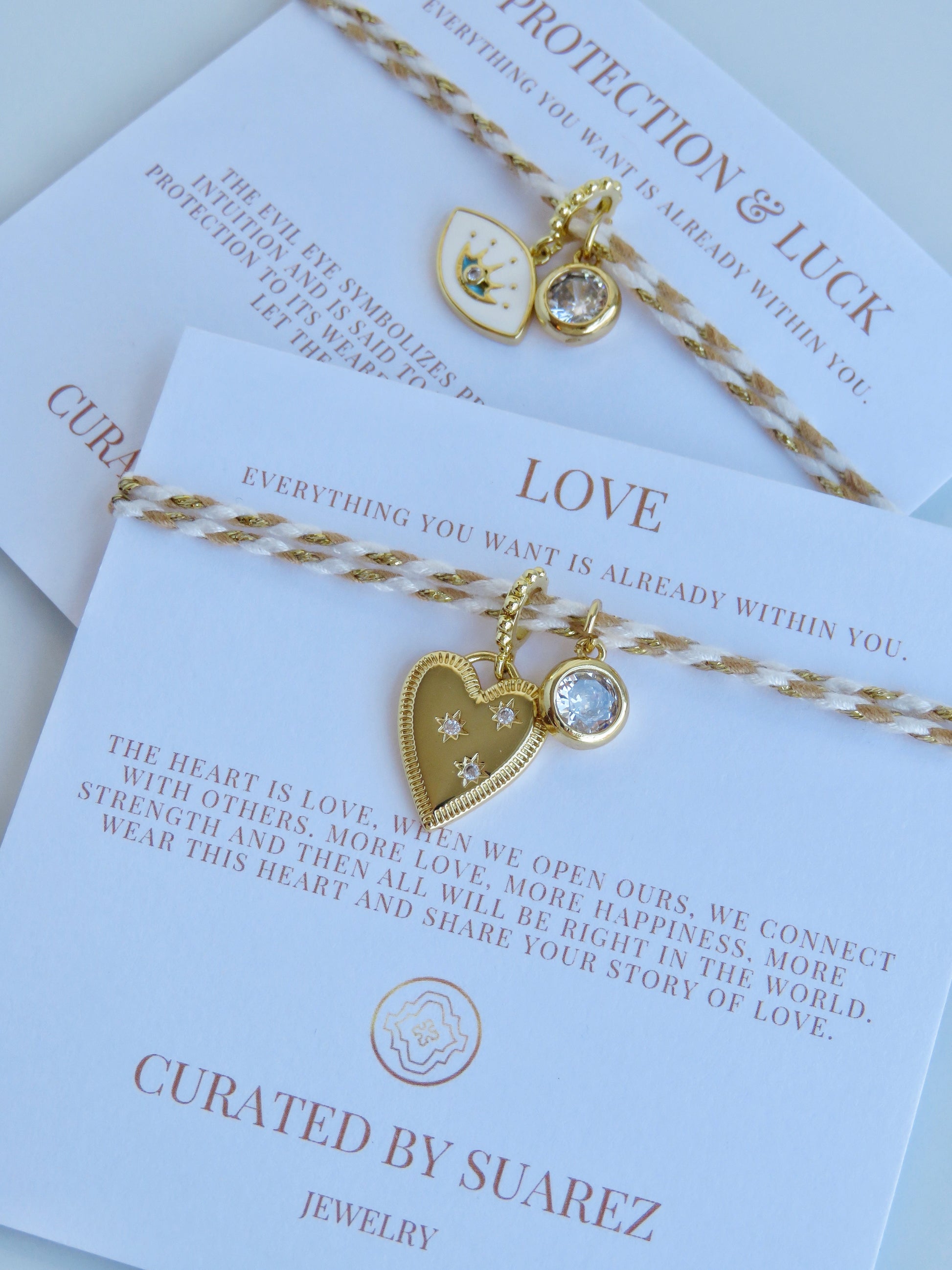 - Adjustable fabric cord bracelet with a an Evil Eye Charm or Heart Charm