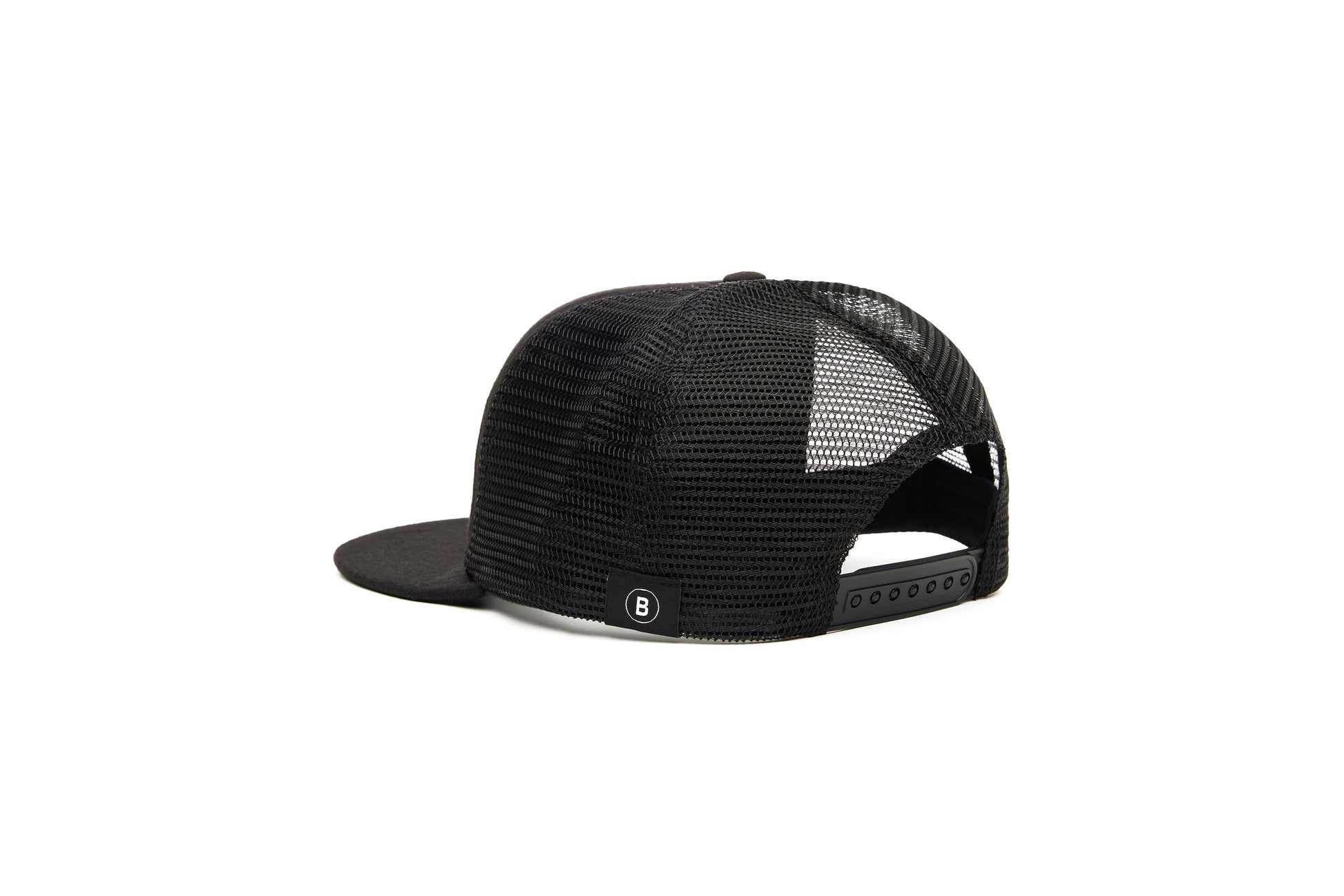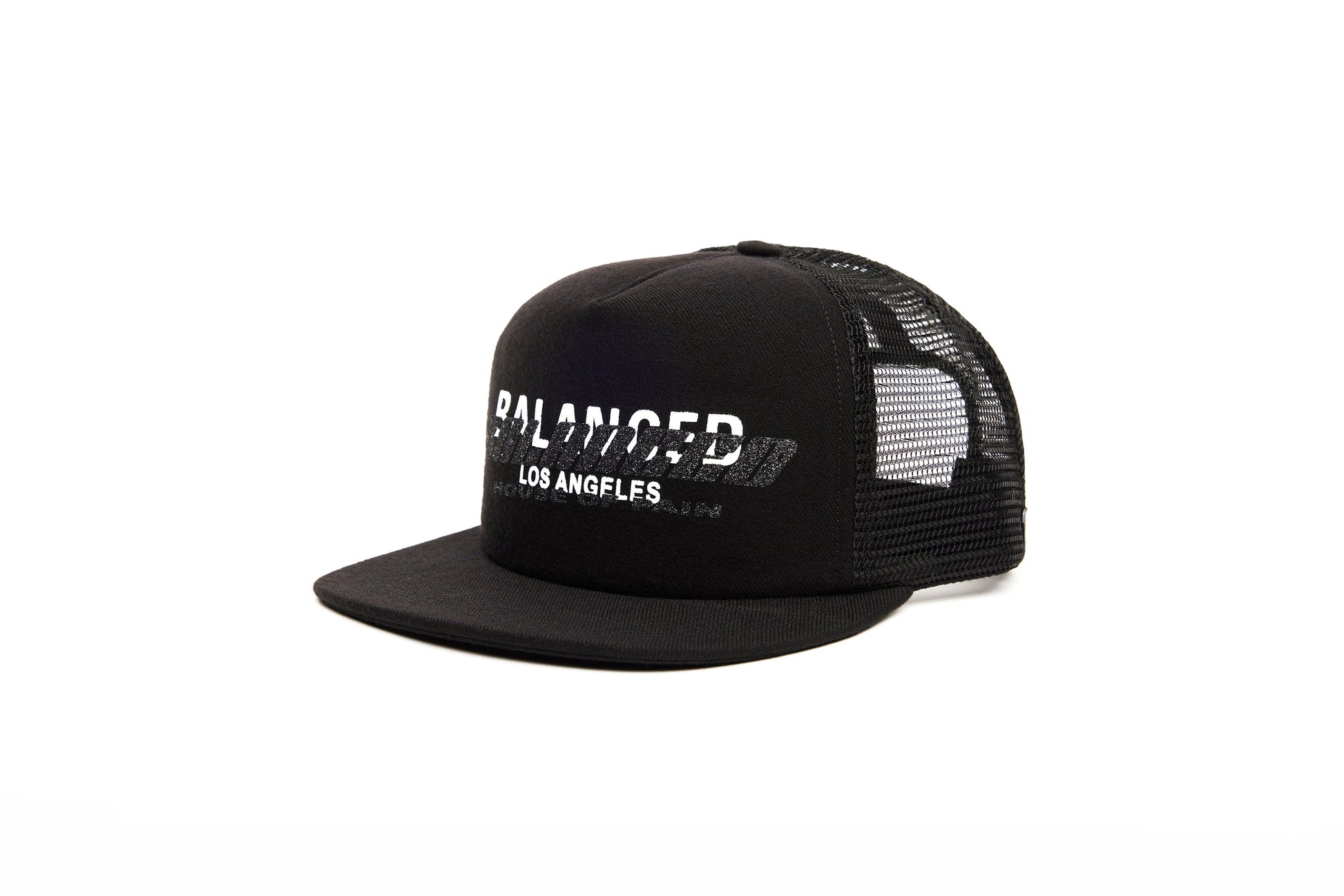 Twill trucker flat brim hat with adjustable mesh back. Balanced logo silk screen transferred on front panel with vinyl sparkle overlay.