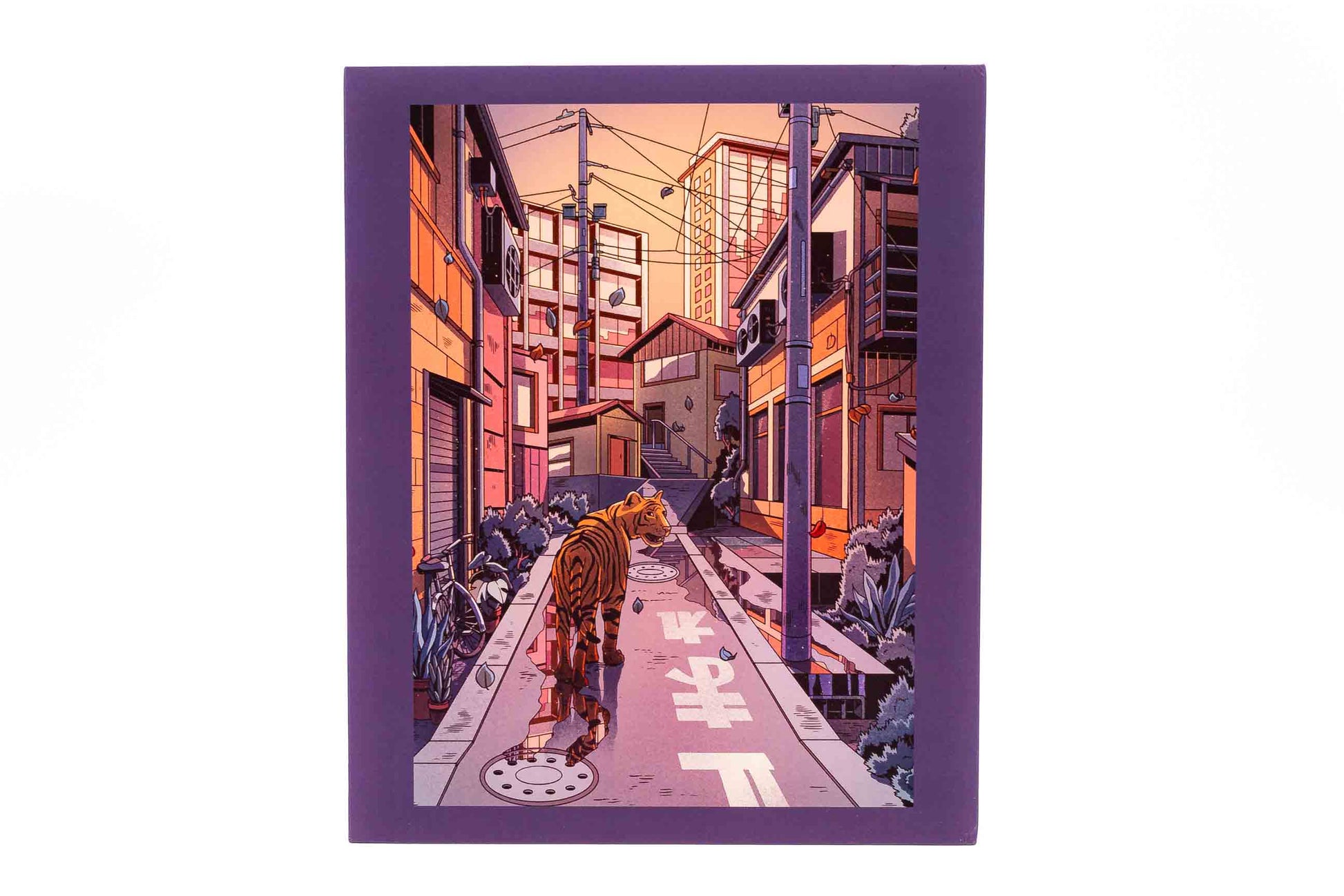 In the stillness of Tokyo's early dawn, the city's maze of buildings and power lines stand bathed in a soft luminescence, awaiting the new day. An unexpected figure—a majestic tiger, seemingly out of place and time—moves silently through the neon-lit backstreets, its powerful stride in harmony with the hushed echo of leaves rustling through the wind.